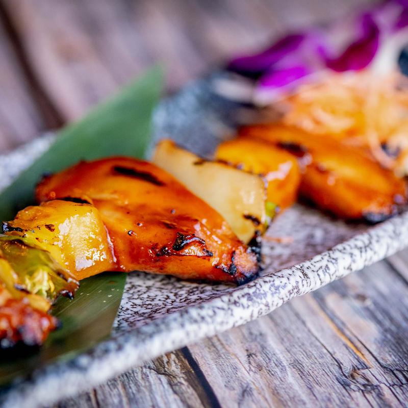 Grilled chicken, sprinkled with chilli with togarashi and BBQ sauce.