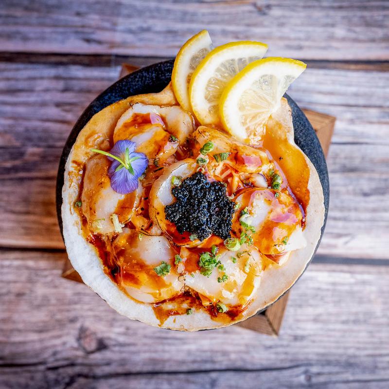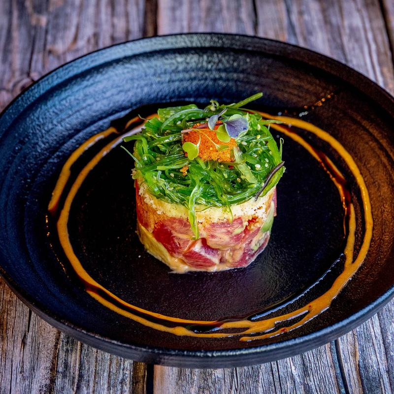 Avocado, fresh tuna, seaweed salad, tempura flakes with spicy mayo, kimchi sauce, and eel sauce.