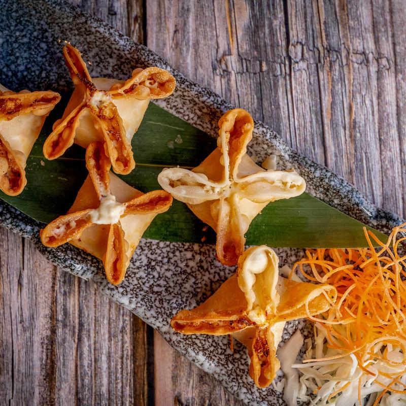 Crispy wonton filled with cream cheese, crabmeat, and vegetables, served with pineapple sauce.