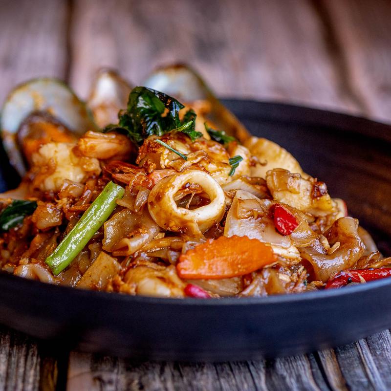 Choices of protein for an additional charge, stir-fried flat noodles shrimp, mussels, scallops, squid spicy with scrambled eggs, onion, bell pepper, basil, and bamboo shoot.