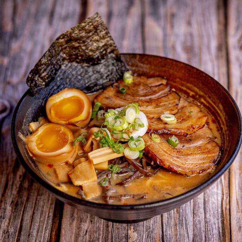 Our tonkotsu pork bone ramen comes with chunky, fatty braised pork belly, ramen noodle (egg noodle) and topped with soft-boiled egg, chopped green onions, bamboo, mushroom, naruto(fish cake), and sesame seeds. Noodle soup