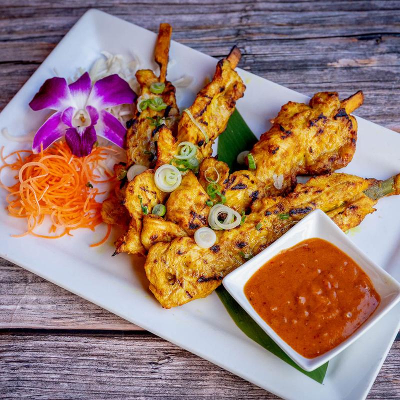 Chicken breast on skewers marinated with Thai herbs, served with peanut sauce.