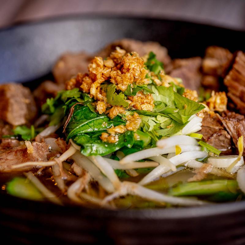 Choices of protein for an additional charge, rice noodle, bean sprouts, Chinese broccoli in house broth. Topped with scallion, cilantro, and fried garlic