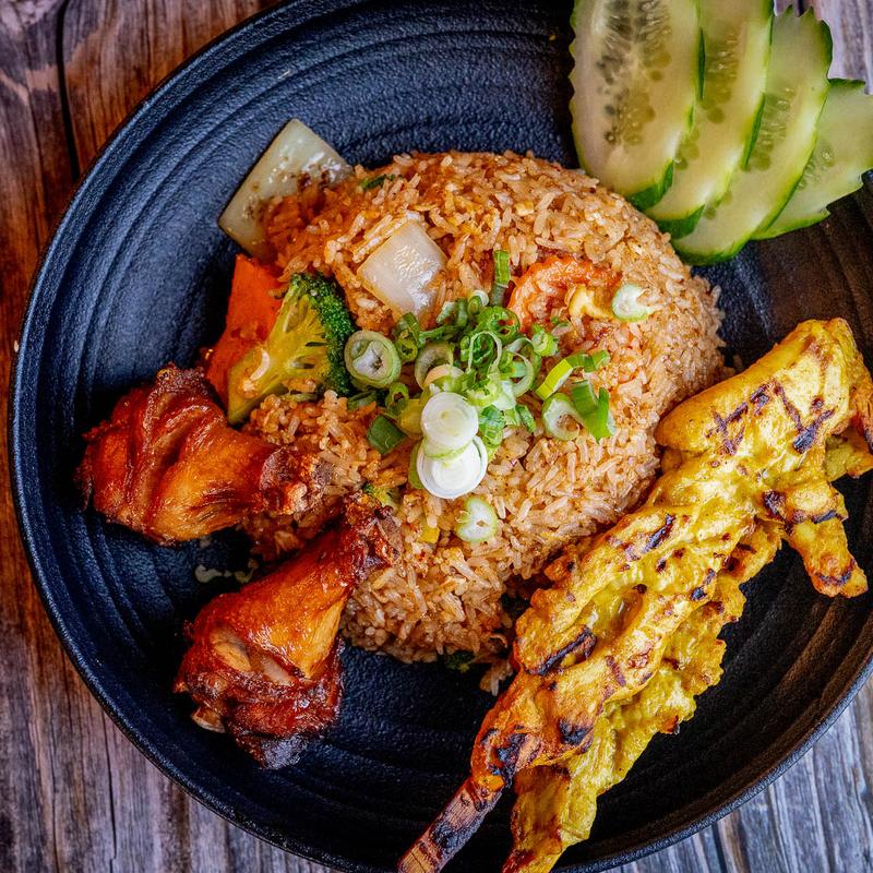Fried jasmine rice, broccoli, carrot, onion, tomatoes, eggs. Served with chicken satay and fried chicken drumsticks.